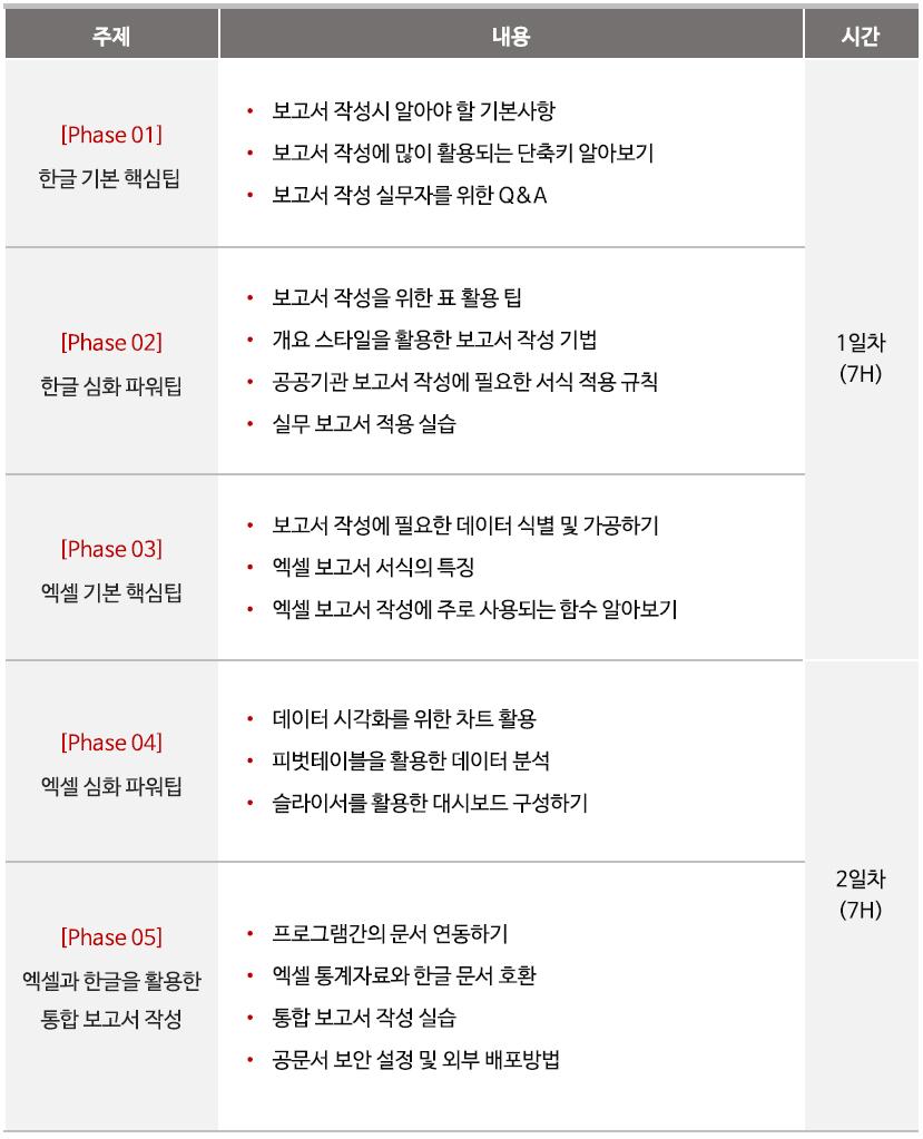 ■ 본 과정은 논리적이고 설득력 있는 보고서 작성에 필요한 한글2022와 엑셀2019의 핵심 기능 요소를 학습합니다.