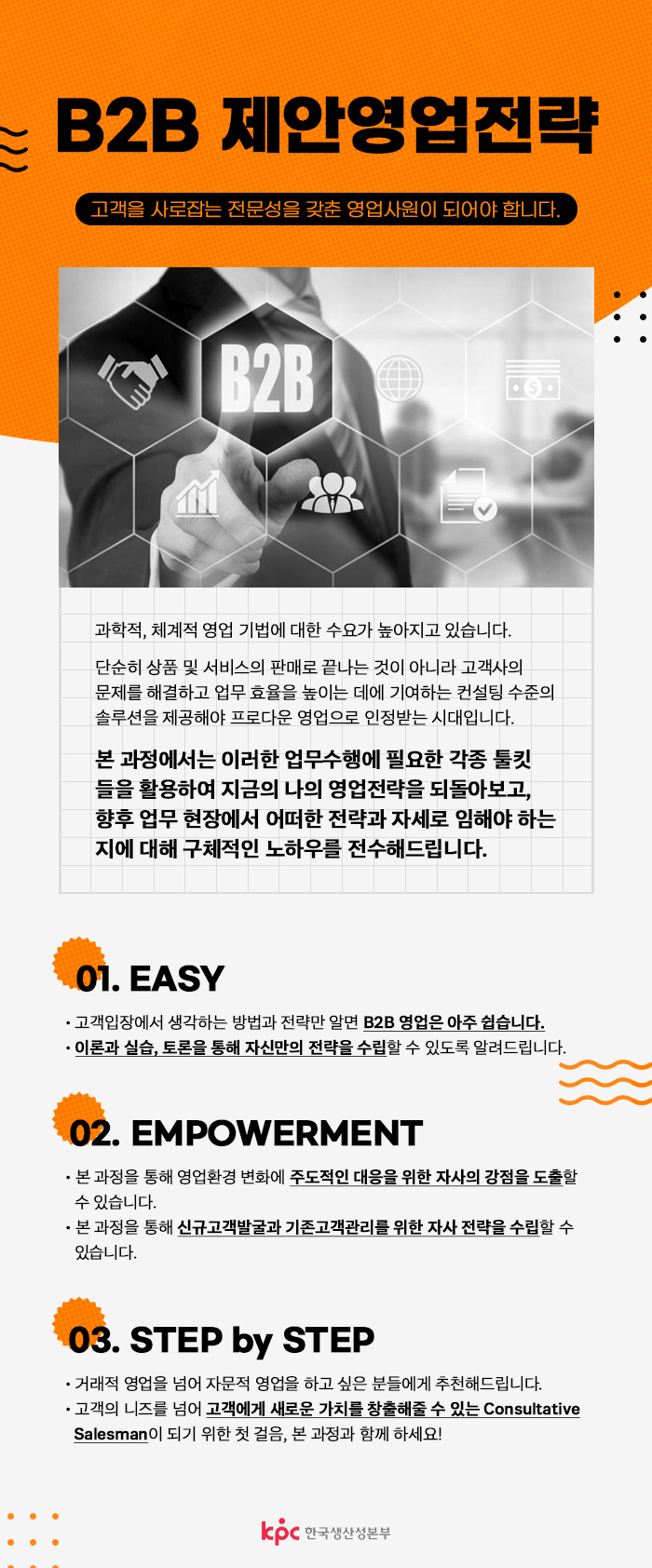 본 과정에서는 이러한 업무수행에 필요한 각종 툴킷 들을 활용하여 지금의 나의 영업전략을 되돌아보고, 향후 업무현장에서 어떠한 전략과 자세로 임해야 하는지에 대해 구체적인 노하우를 전수해 드립니다.