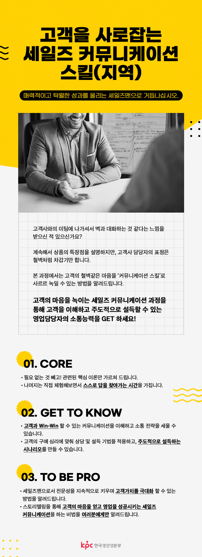 고객의 마음을 녹이는 세일즈 커뮤니케이션 과정을 통해 고객을 이해하고 주도적으로 설득할 수 있는 영업담당자의 소통능력을 GET 하세요!
