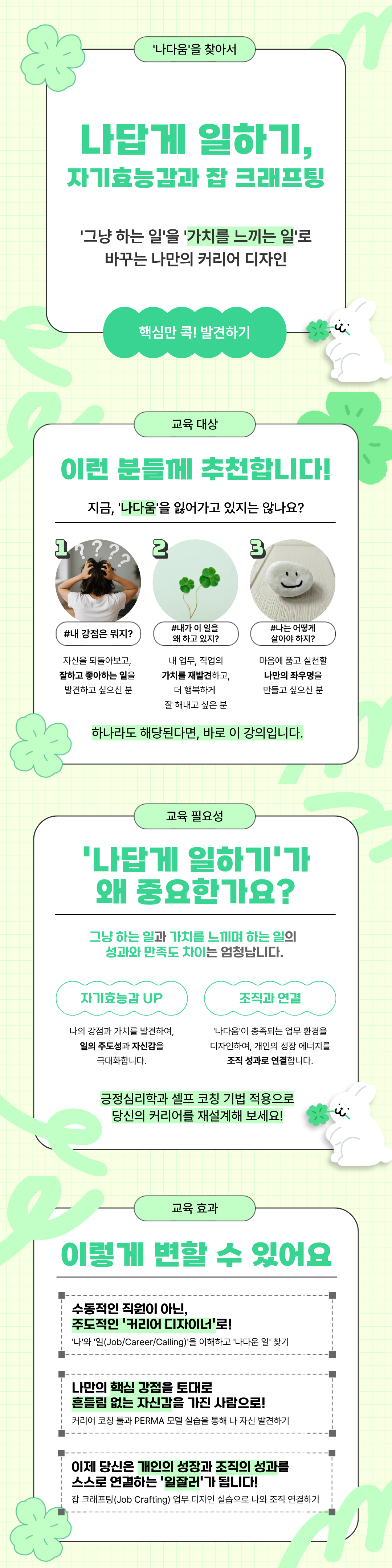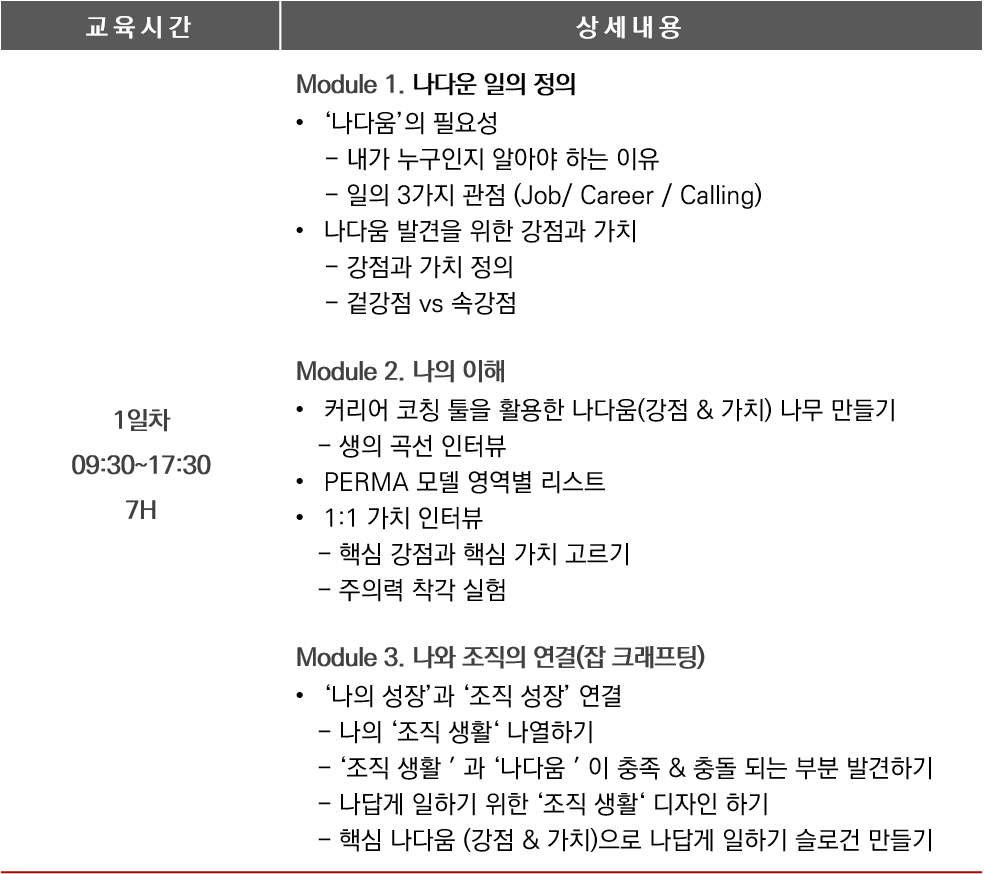 본 과정은 다양한 방법을 통해 강점과 가치를 발견하여 자기 효능감을 갖추고, 업에서의 의미를 찾아 보다 즐겁게 일하고 성과를 도출할 수 있도록 설계되었습니다.